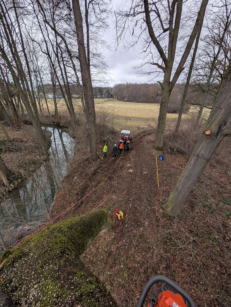 Ein wirklich schwierig zu kletterndem Baum durch die sehr schräge Wuchsrichtung und aufwendig zu abzutragenden Äste welche vom darunter liegenden Gewässer weg geleitet werden mussten. Die wohl schwierigste Fällung die wir bisher hatten.